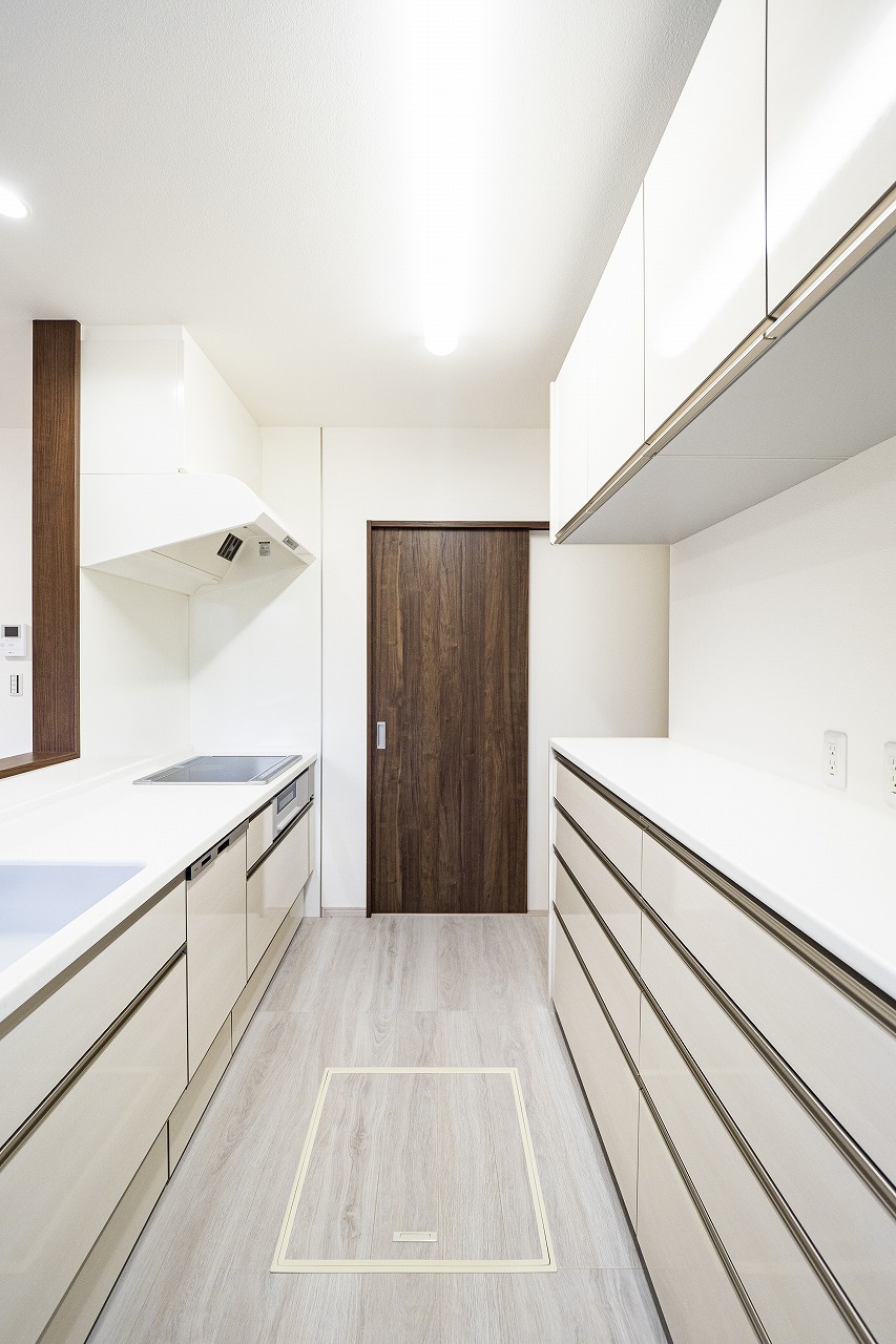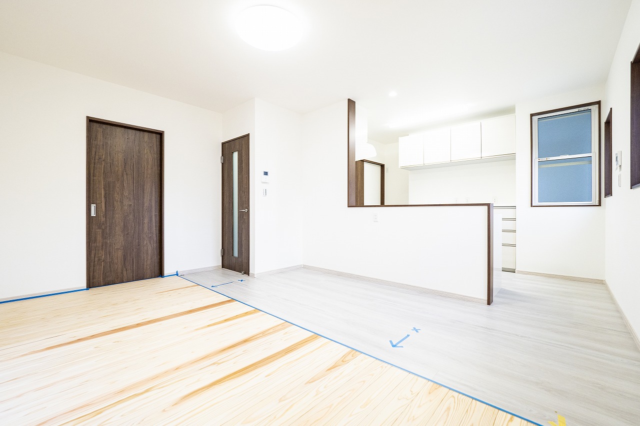 リビングのフローリングの一部に、ご自身で用意された木材を採用。
